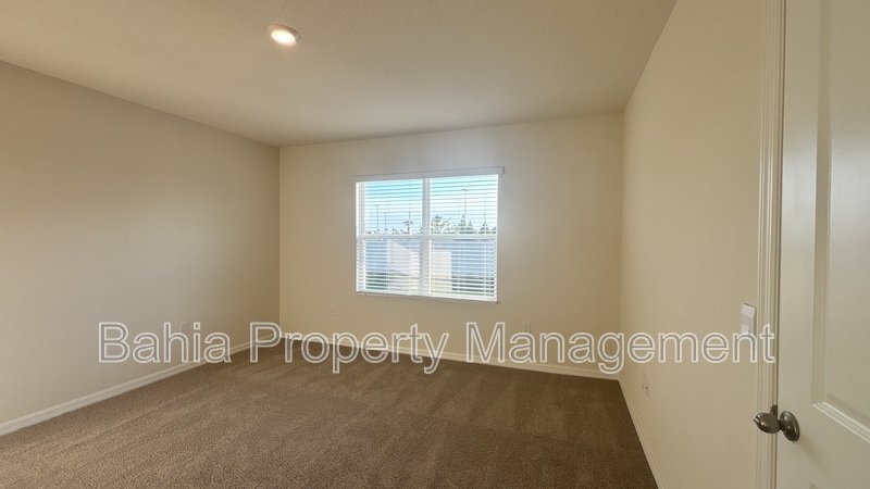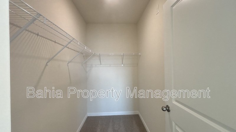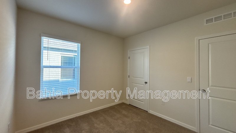 Each bedroom includes carpeted floors and generous closet space, offering flexibility whether used as bedrooms, office space, or guest rooms. The primary suite, tucked away at the rear of the home, boasts a private bath with double vanity and a spacious walk-in closet.